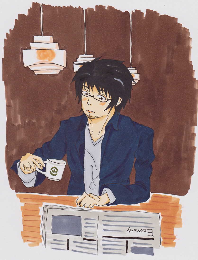 背景適当すぎて状況が分からないですよね。なんか一応、カフェで英字新聞読んでる設定です。勿論飲んでるのはブラックコーヒー。